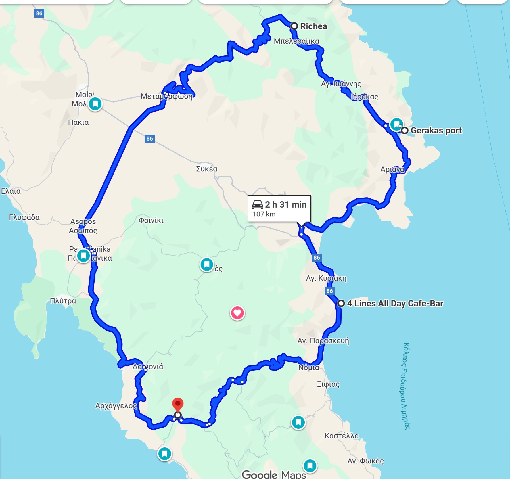 Einer der Ausflüge ab Elika führt über die Berge zu einem bezaubernden Örtchen an einem Fjord – Gerakas Port – und über Monemvasia wieder zurück. Der Link zur Routenplanung von Google ist der Folgende: https://maps.app.goo.gl/EaoRv18r4G8pNDLR8?g_st=im